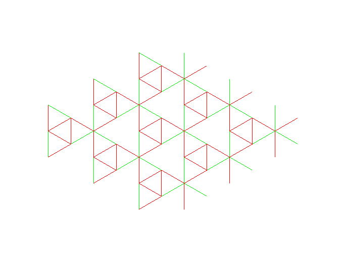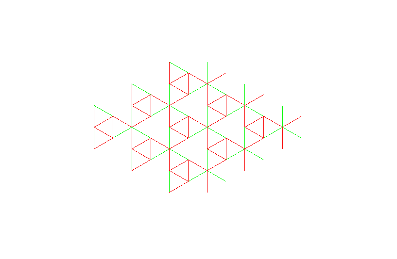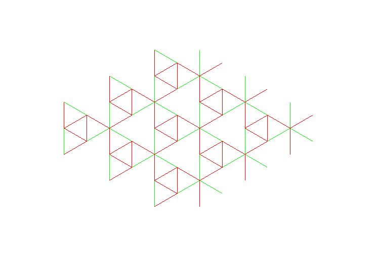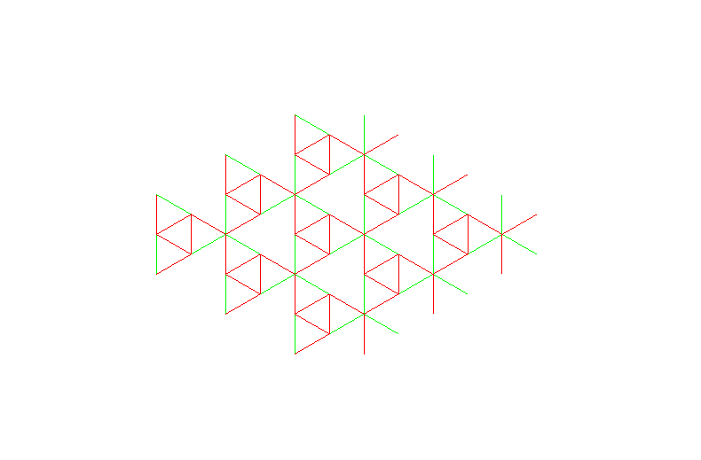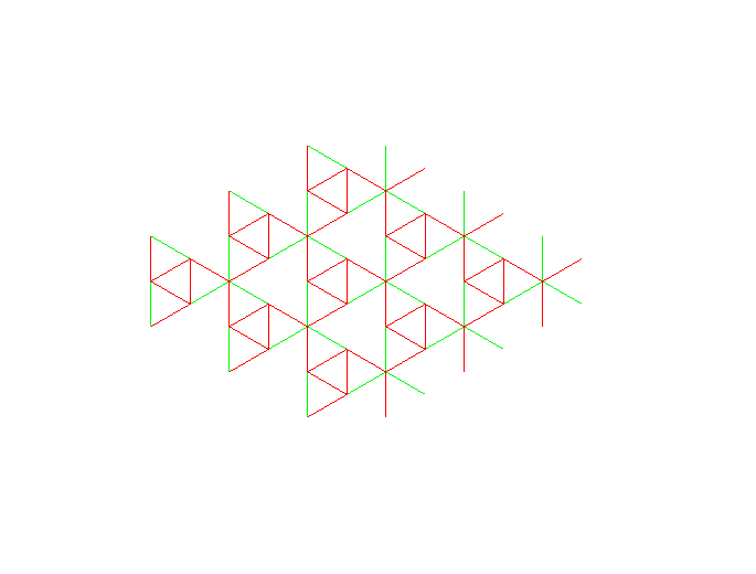 Each of the arc lengths in the bitriangular lattice can be changed periodically without changing the lengths of the other bars. The next three figures show this for the three active (green) arcs per unit cell. It should be clear from the illustrations that changing the length of each of the three active arcs does not require changing the length of the other arcs (to first order) and also induces a global strain (lattice deformation) in the infinite network: